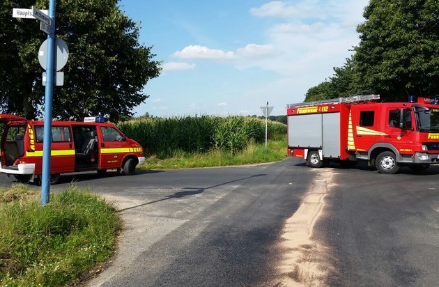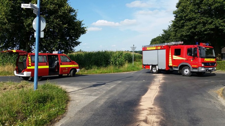 FW-KLE: Erntemaschine verliert Betriebsmittel. Feuerwehr beseitigt 500 Meter Ölspur