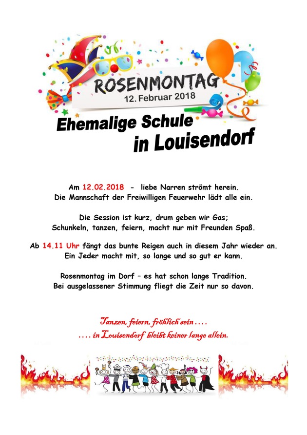 "Die Session ist kurz, drum geben wir Gas; Schunkeln, tanzen, feiern, macht nur mit Freunden Spaß." - unter diesem Motto lädt die Einheit Louisendorf der Freiwilligen Feuerwehr Bedburg-Hau am 12.02.2018 zum traditionellen Rosenmontagstreiben ein. Ab 14:11 Uhr startet die Party in der ehemaligen Schule an der Hauptstraße, nahe dem Sportplatz. Eingeladen ist jeder.