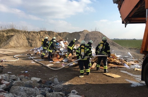Unter schwerem Atemschutz konnte das Feuer schnell gelöscht werden. Dabei wurde das Altpapier von Hand auseinandergezogen, um auch letzte Glutnester abzulöschen.
