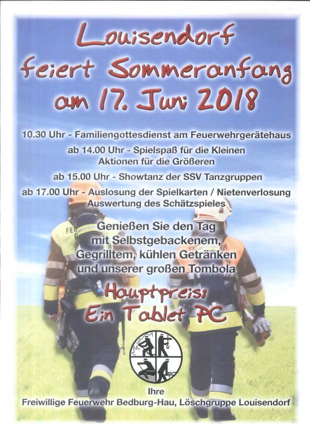 Gemeindebrandinspektor Rainer Schiemann erzählt, was die Besucher erwartet: "Wir beginnen mit einem Familiengottesdienst am Gerätehaus. Danach starten wir mit einem attraktiven Spielprogramm für Kinder und Aktionen für die großen Besucher. Darunter eine große Tombola. Ein Höhepunkt sind die Auftritte verschiedener Showtanzgruppen des SSV Louisendorf, die seit Jahren zum festen Programmpunkt geworden sind".