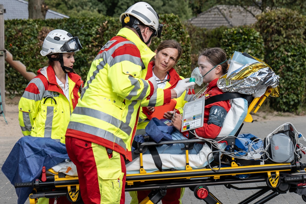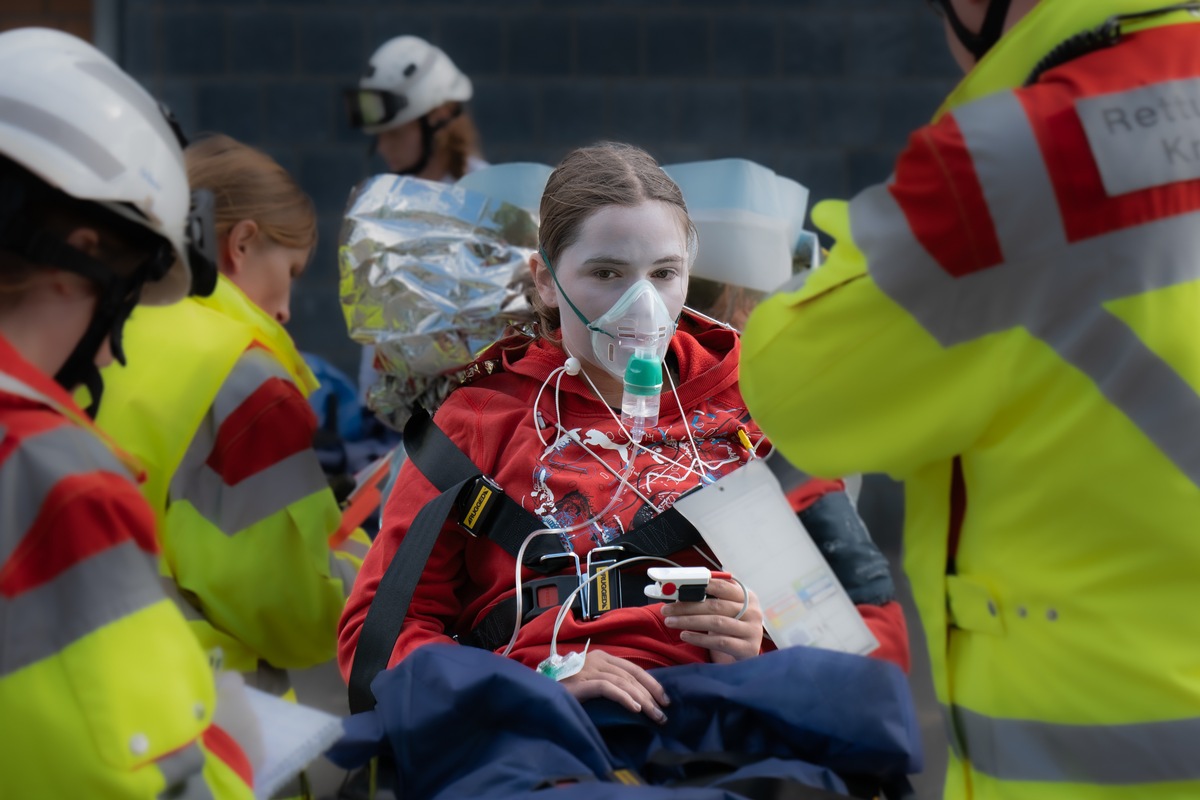 Parallel nutzte der Rettungsdienst des Kreises Kleve die Übung für die Ausbildung: 16 Auszubildende zum Beruf des Notfallsanitäters bzw. der Notfallsanitäterin und sechs Praxisanleiterinnen und -anleiter waren beteiligt. Insgesamt mussten 15 verletzte Personen, darunter fünf Schwerverletzte, versorgt werden. Diese wurden von den realistisch geschminkten Verletztendarstellern der DLRG Bedburg-Hau dargestellt - eine Zusammenarbeit, die für eine besonders authentische Übungsatmosphäre sorgte.