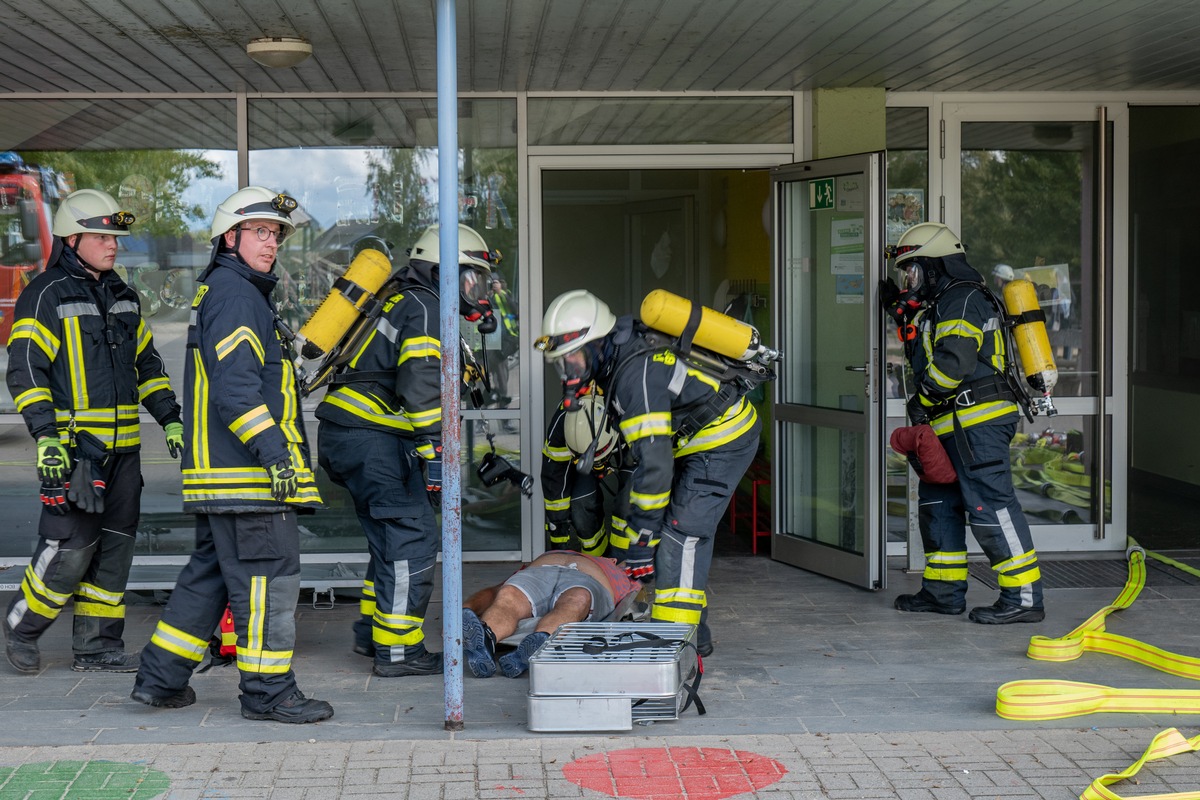 Das Übungsszenario hatte es in sich: Bei Wartungsarbeiten an der Heizungsanlage im Keller kam es zu einer Verpuffung. Beim Versuch, die Anlage stromlos zu schalten, erlitt ein Techniker einen Stromschlag. Das Feuer breitete sich schnell aus, dichter Rauch zog durch das Gebäude - mehrere Kinder wurden in ihren Klassenräumen eingeschlossen.