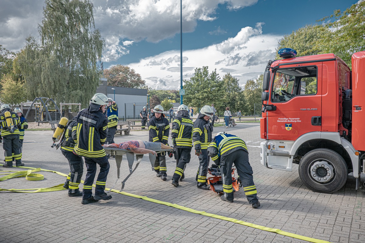 Blaulicht, Martinshörner und dichter Rauch rund um die St. Markus Grundschule in Schneppenbaum - zum Glück war es kein echter Notfall: Eine groß angelegte Einsatzübung der Freiwilligen Feuerwehr Bedburg-Hau fand jetzt in enger Kooperation mit dem Rettungsdienst des Kreises Kleve und den Verletztendarstellern der DLRG Bedburg-Hau statt.