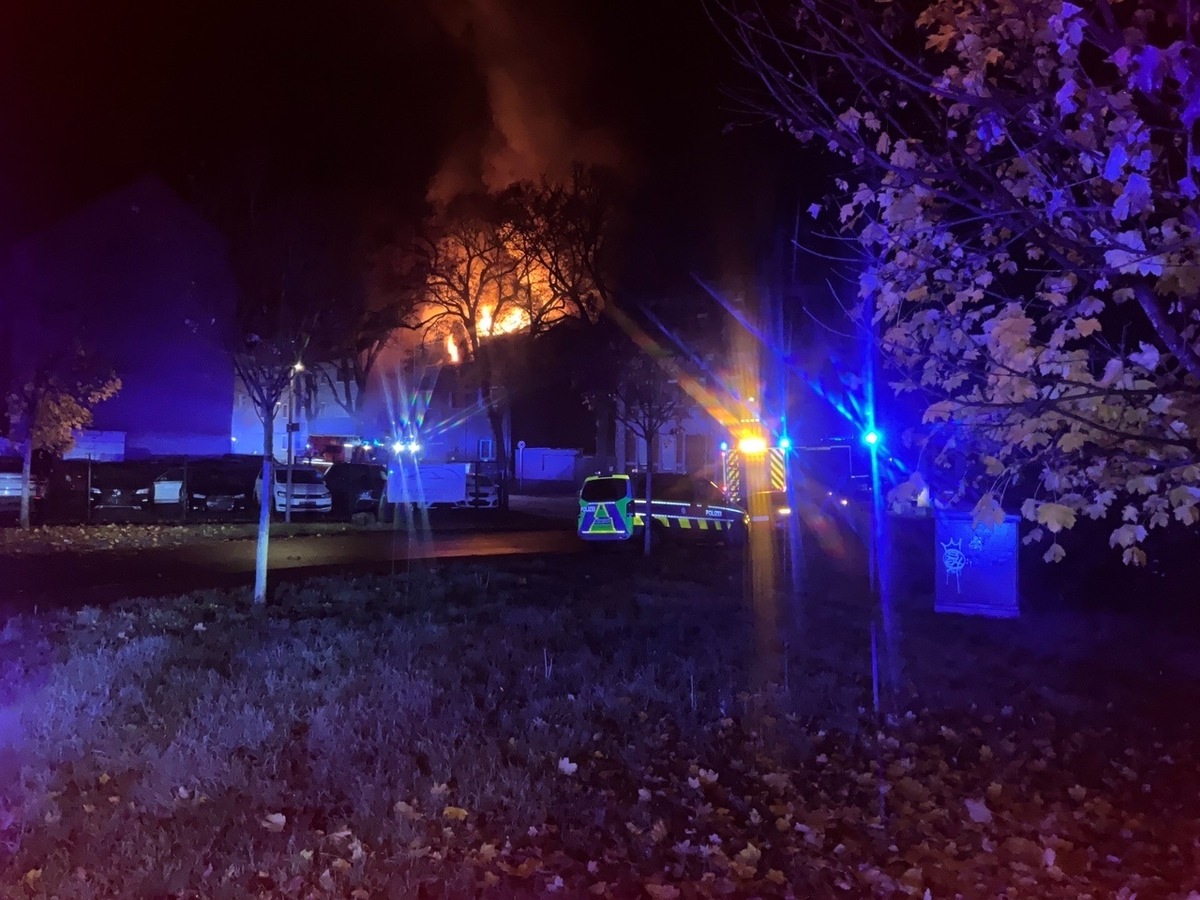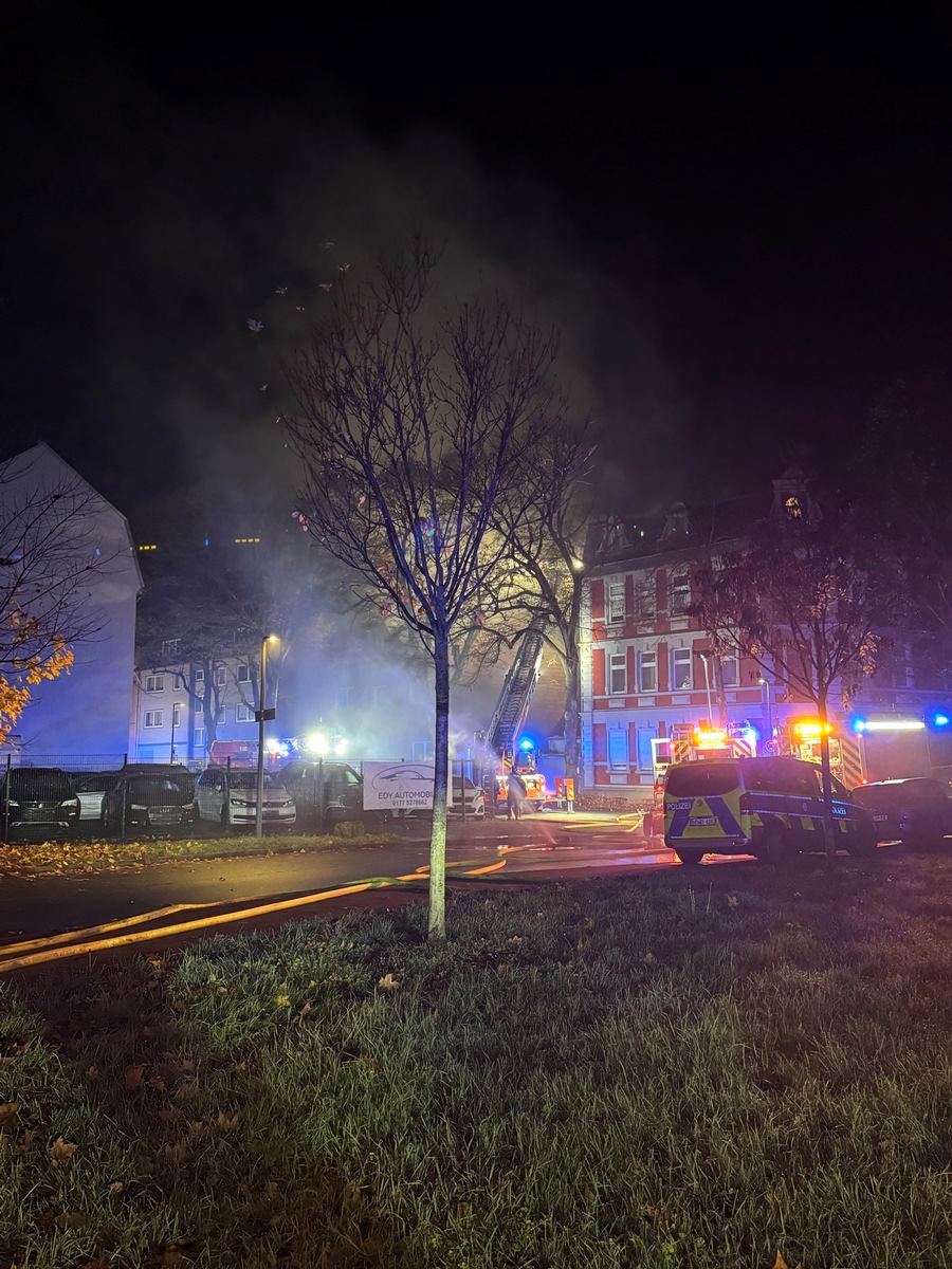 Ein leerstehendes, 2 ½ - geschossiges Gebäude brannte in der Nacht vollkommen aus. Die Feuerwehr war mehrere Stunden im Einsatz. Am Sonntag, den 17.11.2025 um 23:30 Uhr erreichte die Leitstelle der Feuerwehr Gelsenkirchen ein Notruf über die Polizei über ein unklares Feuer in der Straße Auf der Hardt in Bismarck. Die Feuerwehr rückte aufgrund dieser Alarmmeldung zunächst zur Branderkundung mit dem Löschzug der Feuer- und Rettungswache Seestraße aus. Da bereits auf der Anfahrt der brennende Dachstuhl erkennbar war, wurde die Alarmstufe zunächst auf Brand 1 und später auf Brand 2 erhöht. Infolgedessen rückten zusätzlich die Wachen Altstadt und Hessler, die beiden Einsatzleitwagen, der Wechsellader Atemschutz, ein Notarzt und zwei Rettungswagen zur Einsatzstelle aus. Unterstützt wurden die Einsatzkräfte der Berufsfeuerwehr durch die Kameraden der Löschzüge 11 und 13 der Freiwilligen Feuerwehr Gelsenkirchen sowie der Löschzüge 17 und 18, die den Grundschutz für das Stadtgebiet sicherten. Nach der Erkundung des ersteintreffenden Einsatzleiters bot sich folgendes Bild: In dem leerstehenden Gebäude stand der Holztreppenraum im Vollbrand und das Feuer hatte bereits auf den Dachstuhl und die Wohnungen übergegriffen. Der Brand dehnte sich schnell aus, sodass bereits nach kurzer Zeit das Gebäude im Vollbrand stand. Ein Innenangriff war nicht mehr möglich, da die hölzernen Treppen und Decken sowie der Dachstuhl einzustürzen drohten. Zur Brandbekämpfung wurden zwei Drehleitern mit Löschmonitoren vor dem Gebäude in Stellung gebracht sowie vier Mehrzweckstrahlrohre für einen umfassenden Außenangriff eingesetzt. Die Nachbargebäude wurden durch die Einsatzkräfte kontrolliert, für die dort wohnhaften Personen bestand jedoch keine Gefahr. Für die weitere Erkundung wurde auch eine Drohne der Feuerwehr eingesetzt. Ein Baufachberater des Technischen Hilfswerkes wurde für die Beurteilung späterer Sicherungsmaßnahmen an dem Gebäude ebenfalls angefordert. Zum gegenwärtigen Zeitpunkt dauern die Löschmaßnahmen noch an. Die Feuerwehr Gelsenkirchen ist mit rund 50 Einsatzkräften und 18 Fahrzeugen vor Ort. Die Energieversorger für Strom und Gas befinden sich für Sicherungsmaßnahmen ebenfalls an der Einsatzstelle. Die Polizei hat die Ermittlungen zur Brandursache aufgenommen. Über die Schadenshöhe können derzeit keine Angaben gemacht werden.