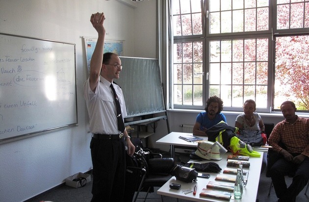 Zudem erläutert der Vertreter der Feuerwehr in seinen Vorträgen, wie die Männer und Frauen in der Feuerwehr selbst ehrenamtlich oder beruflich aktiv werden können, wenn dies im Laufe ihres Aufenthalts in Deutschland einmal ihr Wunsch ist. Denn in den Herkunftsländern sind die Feuerwehren oftmals gänzlich anders strukturiert als in Deutschland. Oft ist die Feuerwehr Teil der polizeilichen oder gar der militärischen Staatsgewalt, wodurch sie weniger als helfende, sondern fast schon als autoritäre Organisation wahrgenommen wird. Das ehrenamtliche Engagement in der Feuerwehr, ohne das der Brandschutz und die Hilfeleistung in Deutschland gar nicht auskämen, ist in vielen Ländern völlig unbekannt. Dies belegt den Stellenwert, den diese Informations-Vorträge der Feuerwehr in den VHS-Kursen haben.