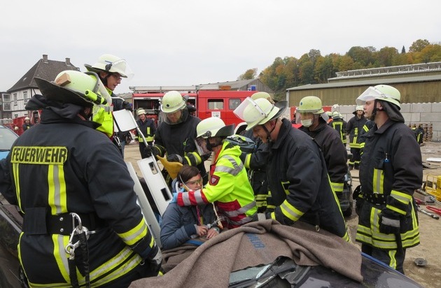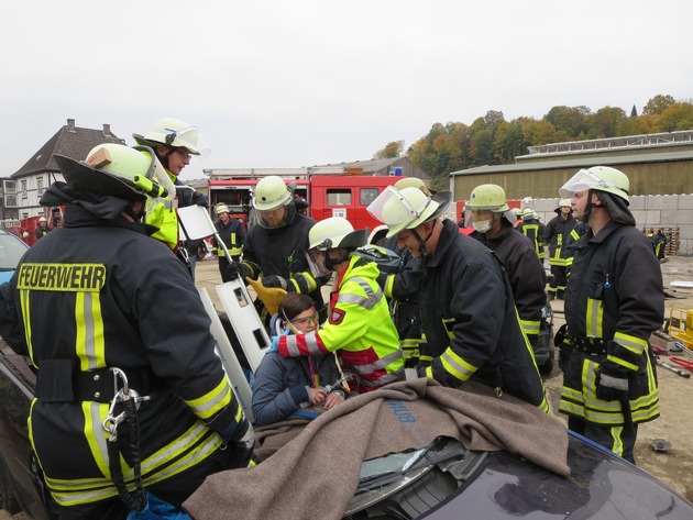 Um möglichst realistische Übungsbedingungen zu gewährleisten, hatte das Team der Übungsleitung auf dem Werksgelände der Firma Ritschny in Arnsberg "Zu den Werkstätten 29" ein Szenario vorbereitet, das auf den ersten Blick von einem echten Verkehrsunfall nicht zu unterscheiden war: