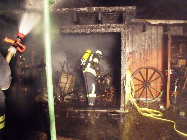 FW-AR: Feuer zerstört Holz- und Geräteschuppen in Voßwinkel