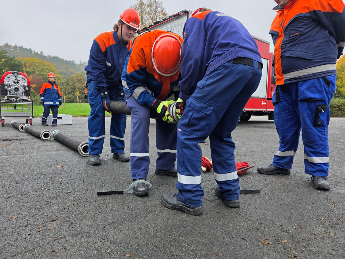 Im feuerwehrtechnischen Bereich mussten die Teilnehmenden unter anderem ein Standrohr auf einem Hydranten montieren und in Betrieb nehmen, um Löschwasser aus dem örtlichen Trinkwassernetz zu entnehmen. Zudem wurden Einsatzmittel UVV-gerecht vom Löschfahrzeug entnommen und deren Einsatzgebiete sowie die Handhabung erklärt. In einer Gruppenaufgabe galt es, eine Saugleitung aufzubauen und an eine Pumpe anzuschließen, wie sie bei der Wasserentnahme aus offenen Gewässern verwendet wird.