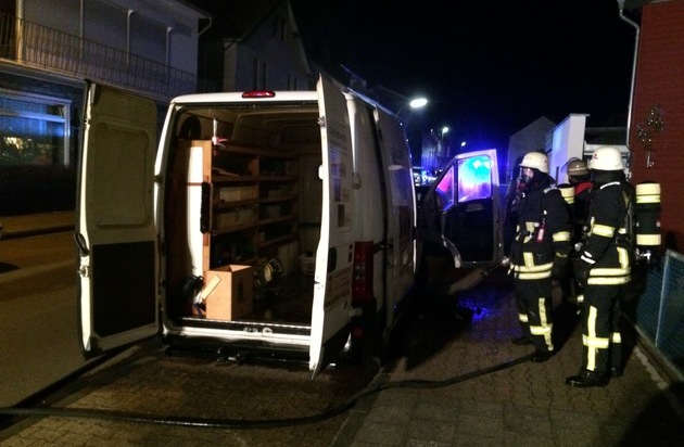 Als Amtshilfe für die Polizei wurden die Feuerwehrbeamten gegen 23 Uhr in die Straße "Bernhardshammer" gerufen. Noch während der Einsatzmaßnahmen vor Ort, erreichte die Feuerwehrwache ein Notruf über einen brennenden Kleintransporter in der Breiniger Stefanstraße. Hierzu wurden die Löschgruppe Breinig und das Hilfeleistungslöschfahrzeug der Feuerwache alarmiert. Mit einem C-Rohr unter Atemschutz löschten die Kräfte der Löschgruppe Breinig das Feuer auf der Ladefläche ab.