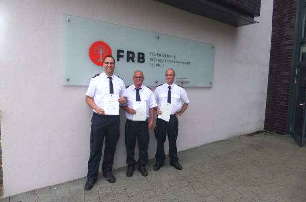 Nach einem 80-stündigen Aufbaulehrgang konnten die Stolberger Feuerwehrmänner Hauptbrandmeister Dieter Albrecht, Oberbrandmeister Michael Bartz und Oberbrandmeister Norbert Janssen erfolgreich die Ergänzungsprüfung zum Notfallsanitäter an der Feuerwehr- und Rettungsdienstakademie in Bocholt ablegen.