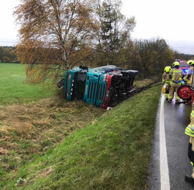 Zu einem schweren Verkehrsunfall mit einem LKW wurde die Feuerwehr der Kupferstadt Stolberg am Freitagmorgen gegen 8.06 Uhr zum Burgholzer Graben (Kreisstraße 6) zwischen Zweifaller- und Höhenstraße gerufen. Laut Notruf war ein Sattelschlepper von der Straße abgekommen, seitlich in den Graben gekippt und der Fahrer im Führerhaus eingeschlossen. Aufgrund der detaillierten Meldung wurde sofort von der Einsatzzentrale der Feuer- und Rettungswache Stolberg der Rüstzug, die Löschgruppen Atsch, Donnerberg und Stadtmitte sowie Rettungswagen und Notarzt zum Unfallstelle entsandt. Bereits nach wenigen Minuten waren die ersten Einsatzkräfte vor Ort. Der Fahrer des Lastwagen hatte sich bereits selber aus seinem Fahrzeug befreit. Nach einer ersten medizinischen Untersuchung und Versorgung wurde er mit leichteren Verletzungen in einem Rettungswagen zum Krankenhaus transportiert. Zur Bergung des Fahrzeuges und Reinigung der Unfallstelle wird die Straße vermutlich bis zur Mittagszeit komplett gesperrt bleiben.