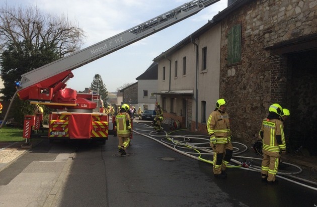 Eine große und weit sichtbare Rauchwolke stand am Sonntagmittag über Werth. In einem Wohnhaus mit angebauter Scheune in der Dorfstraße war ein Feuer ausgebrochen, das bereits auf das Dachgeschoss übergegriffen hatte. Zahlreiche Notrufe gingen kurz vor 12 Uhr in der Einsatzzentrale der Feuer- und Rettungswache ein. Gemeldet wurde eine brennende Scheune, die an einem Haus angebaut sei, mit einer sehr starken Rauchentwicklung. Daraufhin eröffnete der Disponent unter dem Einsatzstichwort "Bauernhof" den Einsatz und alarmierte den Löschzug der Feuerwache, den 4. und 5. Löschzug mit den Löschgruppen Gressenich, Werth, Mausbach, Vicht und Zweifall sowie Rettungswagen und Notarzt. Nach wenigen Minuten trafen bereits die ersten Einsatzkräfte vor Ort ein und fanden folgende Lage vor: Vollbrand eines Anbaus an der Rückseite des Gebäudes, der schon soweit auf das Dachgeschoss des Wohnhauses übergegriffen hatte, dass die Flammen bereits durch die durchgebrannte Dachhaut schlugen. Anwohner teilten mit, dass sich noch ein Hund im Gebäude befinden sollte. Sofort wurden parallel ein Löschangriff von außen von der Rückseite des Gebäudes vorgetragen, zwei weitere Trupps drangen durch den Eingangsbereich in das Erd- und Dachgeschoss zur Rettung des Hundes und zur Brandbekämpfung vor. Insgesamt wurden drei Strahlrohe im Innen- und zwei im Außenangriff vorgenommen. Zuerst konnten die Feuerwehrkräfte zwei Kaninchen aus dem Erdgeschoss retten und kurze Zeit später den Hund. Alle drei Tiere wurden mit Sauerstoff behandelt. Da der Hund augenscheinlich dem Rauch stärker ausgesetzt war, wurde er in eine Tierklinik gebracht. Von der Drehleiter aus wurde ein weiteres Strahlrohr zur Bekämpfung der Flammen eingesetzt und die Dachhaut geöffnet. Aufgrund des umfangreichen, aber sehr dosiert vorgetragenen Löschangriffes, konnte eine weitere Brandausbreitung schnell verhindert und das Feuer schnell gelöscht werden. Menschen wurden nicht verletzt. Polizei und Kriminalpolizei waren ebenfalls vor Ort. Auch Kreisbrandmeister Bernd Hollands machte sich vor Ort ein Bild über die Löscharbeiten. Insgesamt befanden sich rund 75 Kräfte unter Leitung von Amtsleiter Andreas Dovern im Einsatz. Nach rund zwei Stunden Einsatzdauer konnte "Feuer aus" gemeldet werden. Zur Sicherheit stellte die Löschgruppe Werth noch eine Brandwache bis gegen 17 Uhr.
