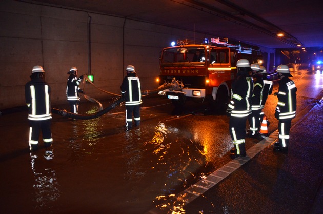 Rund 30 Unwettereinsätze beschäftigte die Feuerwehr der Kupferstadt Stolberg in der Nacht zum Montag im Stadtgebiet Stolberg. Was gegen 22 Uhr mit zahlreichen Gewitterblitzen und Donnergrollen begann, ging gegen 22.30 Uhr in Sturmböen und Starkregen über. So stand das Notruftelefon in der Einsatzzentrale der Feuer- und Rettungswache in Stolberg lange Zeit nicht still. Lange Zeit bestand für unsere Region eine sogenannte Vorabinformation für ein Unwetter, welche dann am späten Abend zu einer Unwetterwarnung hochgestuft wurde. Nachdem die ersten Notrufe gegen 22.45 Uhr aus den Bereichen Büsbach, Münsterbusch und Atsch eingegangen waren, wurde die Einsatzzentrale personell verstärkt sowie die Löschgruppen Atsch, Büsbach und Münsterbusch alarmiert. Die Koordination der Einsätze und die Gesamteinsatzleitung wurde von Herbert Wiese, stellvertretender Leiter der Feuerwehr, von der Einsatzzentrale aus übernommen. Neben zahlreich mit Wasser vollgelaufene Keller mussten auch mehrere Kanaldeckel, die von den Wassermassen aus ihrer Auflage gedrückt wurden, wieder eingelegt werden. Teile eines Baumes waren in der Atsch auf ein Auto gestürzt. Einen weiteren Einsatzschwerpunkt bildete der Tunnel auf der Europastraße. Hier wurde die Fahrbahn großflächig um rund 80 Zentimeter mit Wasser überflutet. Trotz größter Bemühungen der Einsatzkräfte vor Ort, musste der Tunnel für die Zeit von 23 Uhr bis Montagmorgen gegen 10 Uhr komplett für den Verkehr gesperrt werden. Nachdem die Feuerwehrkräfte bis gegen 3 Uhr heute Morgen rund 30 Einsatzstellen abgearbeitet hatten, folgten am frühen Montagmorgen ab 6 Uhr neue unwetterbedingte Einsätze, die sich über den ganzen Vormittag hinzogen.