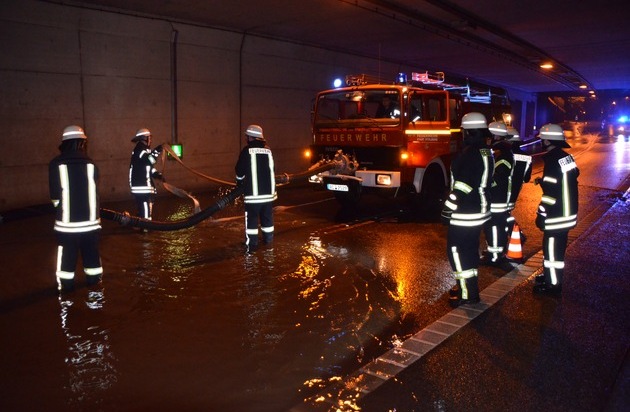 Rund 30 Unwettereinsätze beschäftigte die Feuerwehr der Kupferstadt Stolberg in der Nacht zum Montag im Stadtgebiet Stolberg. Was gegen 22 Uhr mit zahlreichen Gewitterblitzen und Donnergrollen begann, ging gegen 22.30 Uhr in Sturmböen und Starkregen über. So stand das Notruftelefon in der Einsatzzentrale der Feuer- und Rettungswache in Stolberg lange Zeit nicht still. Lange Zeit bestand für unsere Region eine sogenannte Vorabinformation für ein Unwetter, welche dann am späten Abend zu einer Unwetterwarnung hochgestuft wurde. Nachdem die ersten Notrufe gegen 22.45 Uhr aus den Bereichen Büsbach, Münsterbusch und Atsch eingegangen waren, wurde die Einsatzzentrale personell verstärkt sowie die Löschgruppen Atsch, Büsbach und Münsterbusch alarmiert. Die Koordination der Einsätze und die Gesamteinsatzleitung wurde von Herbert Wiese, stellvertretender Leiter der Feuerwehr, von der Einsatzzentrale aus übernommen. Neben zahlreich mit Wasser vollgelaufene Keller mussten auch mehrere Kanaldeckel, die von den Wassermassen aus ihrer Auflage gedrückt wurden, wieder eingelegt werden. Teile eines Baumes waren in der Atsch auf ein Auto gestürzt. Einen weiteren Einsatzschwerpunkt bildete der Tunnel auf der Europastraße. Hier wurde die Fahrbahn großflächig um rund 80 Zentimeter mit Wasser überflutet. Trotz größter Bemühungen der Einsatzkräfte vor Ort, musste der Tunnel für die Zeit von 23 Uhr bis Montagmorgen gegen 10 Uhr komplett für den Verkehr gesperrt werden. Nachdem die Feuerwehrkräfte bis gegen 3 Uhr heute Morgen rund 30 Einsatzstellen abgearbeitet hatten, folgten am frühen Montagmorgen ab 6 Uhr neue unwetterbedingte Einsätze, die sich über den ganzen Vormittag hinzogen.
