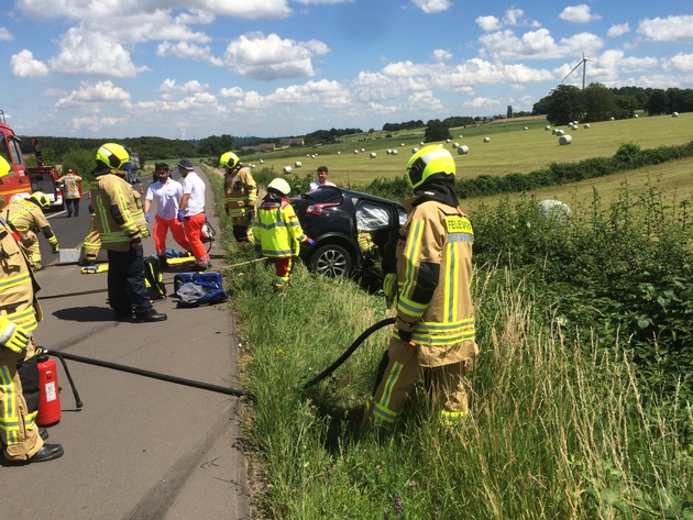 Zwei Verletzte und hoher Sachschaden sind die Bilanz eines schweren Verkehrsunfalles am Mittwochmittag auf der Hastenrather Straße (Kreisstraße 6). Gegen 13.07 Uhr sind in der Höhe der Zufahrt zum Hochweger Hof zwei Autos zusammengestoßen. In Folge des Unfalls ist ein Auto, das mit zwei Personen besetzt war, in den Straßengraben geraten. Der Beifahrer wurde mittelschwer verletzt und konnte das Fahrzeug selbstständig nicht verlassen. Er wurde von der Feuerwehr aus dem PKW befreit und dem Rettungsdienst und Notarzt zur weiteren Behandlung übergeben. Auch die Fahrerin erlitt leichte Verletzungen. Beide wurden mit Rettungswagen in ein Krankenhaus transportiert. Die Feuerwehr war mit dem Rüstzug der Hauptwache und den Löschgruppen Atsch, Donnerberg und Mitte im Einsatz. Bis zum Abschluss der Rettungs- und Bergungsarbeiten blieb die Kreisstraße bis gegen 14.50 Uhr komplett für den Verkehr gesperrt. Bereits am Morgen gegen 7.23 Uhr ereignete sich auf der Straße "Am Allmannshof" ein weiterer Verkehrsunfall, bei dem die Feuerwehr mit einem Hilfeleistungslöschfahrzeug und einem Rettungswagen im Einsatz war. Hier war es zu einem Auffahrunfall mit einer leicht verletzten Person gekommen. Als First Responder wurden die Feuerwehrkräfte der Feuer- und Rettungswache am Vormittag bei einem schweren Arbeitsunfall in Gressenich tätig.