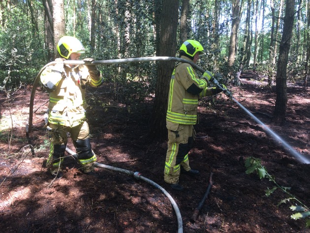 Dank eines umsichtigen Spaziergängers konnte am frühen Dienstagmittag ein größerer Flächen-/Waldbrand verhindert werden. Gegen 11.10 Uhr meldete der Spaziergänger einen Flächenbrand im Waldbereich zwischen Friedensstraße und Wasserturm. Da aufgrund der anhaltenden Trockenheit die Gefahr einer großen Brandausbreitung besteht, wurden sofort der Löschzug der Feuer- und Rettungswache sowie die Löschgruppe Mausbach alarmiert. Als die ersten Einsatzkräfte eintrafen, brannte es auf einer Fläche von gut 50 Quadratmeter. Zur Brandbekämpfung wurden Feuerpatschen und ein C-Rohr vorgenommen. Plötzlich auftretende Windböen verschärfte die Lage. In Sekunden breitete sich das Feuer großräumig auf rund 500 Quadratmeter aus. Um die Gefahr einer weiteren Ausbreitung zu verhindern und eine entsprechende Brandbekämpfung vornehmen zu können, wurde die Alarmstufe erhöht und die Löschgruppen Vicht, Zweifall, Breinig, Dorff, Venwegen und Gressenich nachgefordert. Mit rund 50 Feuerwehrleuten waren die Flammen schnell unter Kontrolle. Nachdem das Feuer endgültig gelöscht war, wurden ausgiebige Nachlöscharbeiten durchgeführt. Dabei wurden die Glutnester und der Waldboden mit viel Wasser durchtränkt. Die große Wärme machte auch den Einsatzkräften zu schaffen. So wurden die Nachlösch- und Aufräumarbeiten unter sogenannter "Marscherleichterung" durchgeführt.