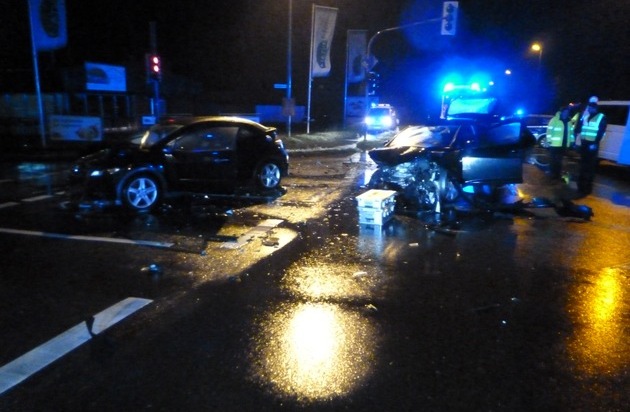 Um 23:24 Uhr wurden die Feuerwehr und der Rettungsdienst zu einem schweren Verkehrsunfall auf der Weseler Str. in Dinslaken alarmiert. Vor Ort fanden die Einsatzkräfte zwei schwer beschädigte Fahrzeuge auf der Kreuzung vor. Hierbei wurden zwei Personen verletzt. Die erste Meldung, dass eine Person noch im Fahrzeug eingeklemmt ist, hat sich vor Ort nicht bestätigt. Die verletzten Personen wurden an der Einsatzstelle notärztlich versorgt und zur weiteren Behandlung in die Dinslakener Krankenhäuser transportiert. Die Feuerwehr hat die beteiligten Fahrzeuge gesichert und die Batterien vorsorglich abgeklemmt. Die Weseler Str. musste im Kreuzungsbereich komplett gesperrt werden, gegen 00:05 Uhr war der Einsatz seitens der Feuerwehr beendet.