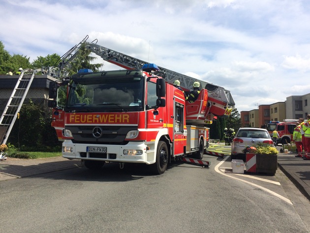 In den Mittagsstunden wurde die Feuerwehr Dinslaken zu einem Dachbrand auf dem Rembrandtweg alarmiert. Bei eintreffen der ersten Einsatzkräfte stieg dichter Rauch aus dem Dach eines Bungalow. Mehrere Personen auf dem Dach und im Gebäude wurden durch die Feuerwehr in Sicherheit gebracht. Eine pflegebedürftige Person wurde durch den Rettungsdienst betreut. Für diese Person wurde im weiteren Verlauf, mit Unterstützung des Ordnungsamtes der Stadt Dinslaken eine vorübergehende Unterbringung in einem Pflegezentrum organisiert. Unterdessen wurde der Brand mit mehreren Trupps der Feuerwehr bekämpft. Dabei wurden Rettungssägen zum öffnen der Dachhaut und Löschlanzen eingesetzt. Somit konnte die weitere Ausbreitung des Feuers eingedämmt werden. Die Nachlöscharbeiten gestalteten sich sehr aufwendig, 20m² der Dacheindeckung mussten entfernt werden, um an die Glutnester zu gelangen. Nach knapp vier Stunden war der Einsatz beendet. Insgesamt 45 Einsatzkräfte der Einheiten Hauptwache, Hiesfeld, Stadtmitte sowie der Rettungsdienst waren im Einsatz.
