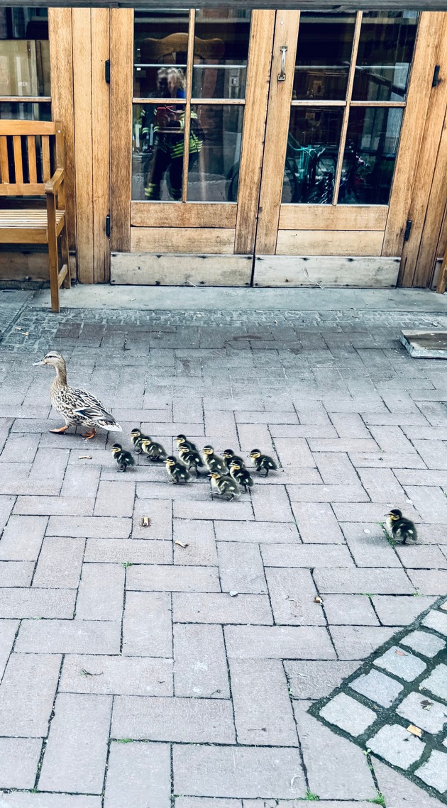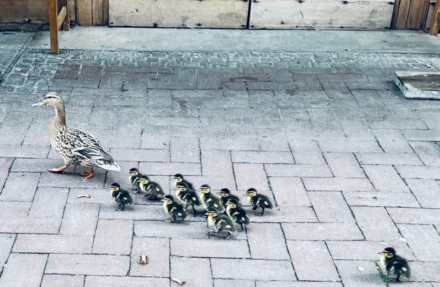 Ein nicht alltäglicher Einsatz beschäftigte am heutigen Sonntag die Feuerwehr Dinslaken. Ein aufmerksamer Bürger hatte in der Innenstadt auf einem Flachdach eine Entenfamilie entdeckt und daraufhin die Einsatzkräfte alarmiert. Da die Küken noch sehr klein waren und das Dach nicht eigenständig sicher verlassen konnten, verschaffte sich die Feuerwehr vor Ort ein Bild der Situation. Dabei fanden die Einsatzkräfte eine Entenmutter mit insgesamt zwölf Küken vor. Die Feuerwehr entschied sich, die Tiere mithilfe einer vierteiligen Steckleiter und eines Transportkorbs zu retten. Während der Rettungsmaßnahmen flatterte die Entenmutter jedoch selbstständig vom Dach auf den Boden. Fünf der Küken folgten ihr im Sprung und konnten von den Feuerwehrkräften sicher aufgefangen sowie wohlbehalten am Boden abgesetzt werden. Die verbleibenden sieben Küken wurden behutsam in eine Transportbox gesetzt und anschließend ebenfalls nach unten gebracht. Dort konnte die Entenfamilie wieder zusammengeführt werden. Spannend wurde es für die Einsatzkräfte im Anschluss ein weiteres Mal: Da die Innenstadt aufgrund des "Energy Run" großräumig abgesperrt war, gestaltete sich auch der Rückweg zur Feuer- und Rettungswache nicht ganz unkompliziert. Die Feuerwehr musste schließlich über Teile der abgesperrten Laufstrecke zurückkehren, um wieder zur Wache zu gelangen. Dabei blickten die Feuerwehrkollegen in viele freundliche Gesichter - zahlreiche Bürgerinnen und Bürger sowie teilnehmende Läuferinnen und Läufer winkten ihnen dabei fleißig zu.