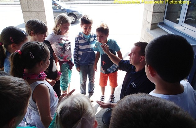 FW-PL: Ferienbetreuung der OGS Grundschule Eschen zu Besuch in der Feuer- und Rettungswache Plettenberg. Brandschutzerzieher erklärte richtigen Umgang mit Feuer. Löschrohr wurde vorgenommen