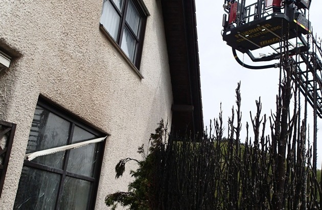 Mit dem Stichwort "Kleinbrand" wurde die Plettenberger Feuerwehr am heutigen Dienstag gegen 13:40 Uhr zur Grabenstraße alarmiert. Anrufer hatten der Feuer- und Rettungsleitstelle einen Hecken- oder Wiesenbrand gemeldet. Bereits auf der Anfahrt erkannten die Kräfte der Feuer- und Rettungswache eine starke Rauchentwicklung im gemeldeten Bereich. Bei Eintreffen stellte sich die Situation zunächst kritisch dar. Eine unmittelbar an einem Wohnhaus gepflanzte Lebensbaumhecke stand in Vollbrand. Die Flammen schlugen entlang der Hausfassade bis unter das Dach. Die Fenster in Erd- und Obergeschoss waren bereits geplatzt. Der Hausbesitzer versuchte mit Hilfe eines Gartenschlauches den Brand zu löschen. Durch unmittelbare Vornahme eines Löschrohres der Feuerwehr konnte ein Übergreifen des Brandes auf das Wohnhaus in buchstäblich letzter Minute verhindert werden. Da Brandrauch in das Haus gezogen war, musste die Feuerwehr nach Beendigung der Löscharbeiten mit einem Hochleistungslüfter das Gebäude entrauchen. Der Hausbesitzer und dessen Frau erlitten einen ordentlichen Schrecken und wurden vorsorglich vom Rettungsdienst untersucht, mussten jedoch nicht einem Krankenhaus zugeführt werden. Vorsorglich kontrollierte die Feuerwehr abschließend die Gebäudefassade und den Dachstuhl über die Drehleiter mit Hilfe einer Wärmebildkamera. Der Brand entstand offensichtlich durch das Abflämmen von Unkraut mit einem Gasbrenner. Obwohl der Hausinhaber nach dessen Aussage mit ausreichend Abstand zur Hecke den Brenner betrieb, geriet plötzlich und in rasanter Geschwindigkeit die Hecke in Brand. Zur Höhe des entstandenen Sachschadens kann die Feuerwehr keine Auskunft erteilen.