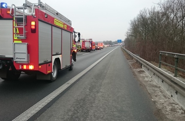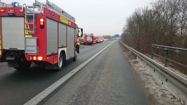 Nachdem die Freiwillige Feuerwehr Werne im vergangenen Jahr 2016 rund 30 Einsätze im Zusammenhang mit mehr oder weniger schweren Auffahrunfällen auf der Bundesautobahn 1 absolviert hatte, setzt sich dieser Trend aktuell unvermindert fort. Heute, am Dienstag, den 07.02.2017, kam es zum bereits fünften Einsatz auf der Autobahn, diesmal in Fahrtrichtung Köln. Um 8:29 Uhr wurde der Löschzug 1 zur Unterstützung des Rettungstransportwagens aus Werne alarmiert. 12 Einsatzkräfte rückten mit drei Fahrzeugen aus, um die Einsatzstelle abzusichern und ggf. weiter unterstützen zu können. Auf der Überholspur war ein BMW aus nicht geklärter Ursache auf einen VW ausgefahren. Die Fahrerin des vorausfahrenden VW wurde dabei verletzt und zur weiteren Untersuchung in ein Krankenhaus eingeliefert. Der Fahrer des BMW blieb unverletzt. Die Feuerwehr half der Polizei mit Hilfe der Großfahrzeuge bei der Sperrung der Autobahn, um die verunglückten PKW auf den Standstreifen zu verbringen. Hierfür wurde die Autobahn für ca. 10 Minuten voll gesperrt, wonach die Straße gereinigt und wieder beide Spuren frei gegeben werden konnten. Gegen 9:10 Uhr wurde die Einsatzstelle an die Polizei übergeben und der Löschzug konnte in den Standort zurückkehren.