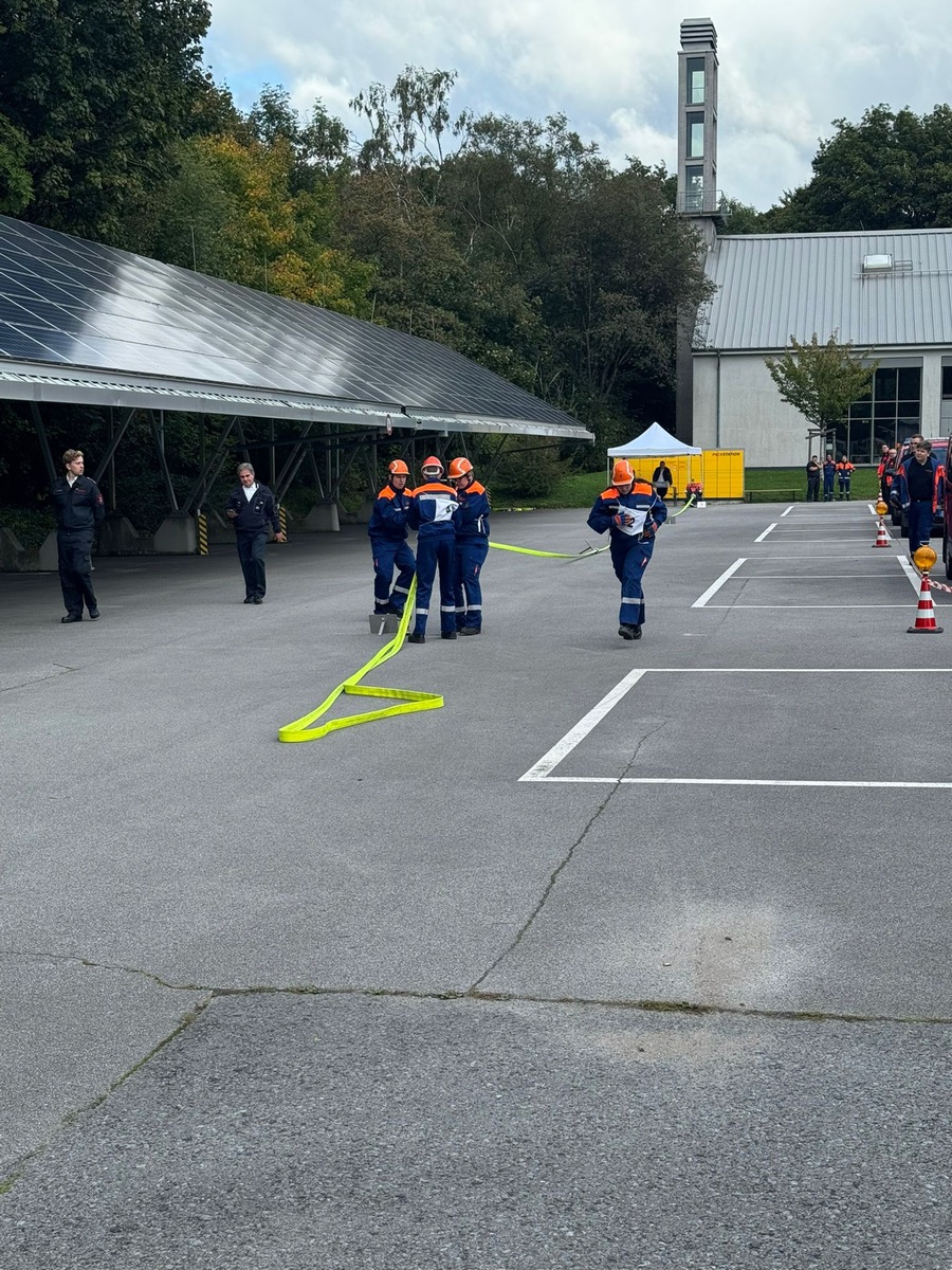 5. Schnelligkeitsübung: Zum Abschluss musste nochmal gerannt werden. Bei der Schnelligkeitsübung galt es von den Jugendlichen insgesamt 8 C-Schläuche auf gerader Fläche zu einer langen Schlauchleitung zu verlegen. Die Schlauchleitung darf keine Dreher haben und muss in 75 Sekunden verlegt sein.