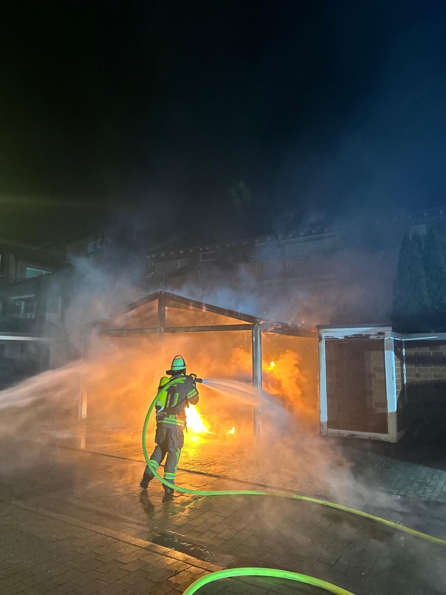 Beim Eintreffen der ersten Einsatzkräfte standen ein Doppelcarport sowie ein darunter abgestellter PKW bereits in Vollbrand. Wenige Meter entfernt brannten zudem mehrere Mülltonnen an einer Hauswand. Aufgrund der Nähe zu angrenzenden Gärten und Schuppen bestand die Gefahr einer weiteren Brandausbreitung.