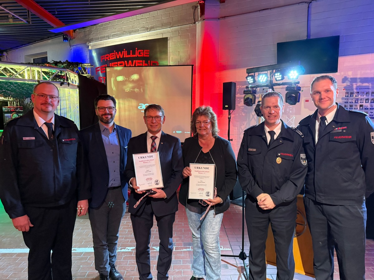 Eine besondere Würdigung erhielten zudem der ehemalige Bürgermeister Lothar Christ sowie die in Kürze in den Ruhestand wechselnde Feuerwehrdezernentin Kordula Mertens. Sie wurden zum Ehrenbrandmeister beziehungsweise zur Ehrenbrandmeisterin ernannt und damit offiziell in die Ehrenabteilung der Freiwilligen Feuerwehr Werne aufgenommen - eine Auszeichnung, die die langjährige und vertrauensvolle Zusammenarbeit mit der Stadt Werne unterstreicht.