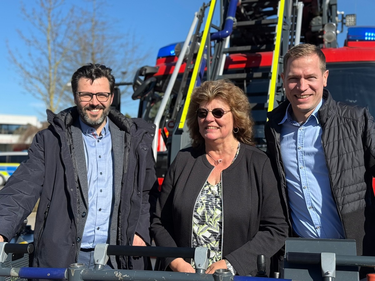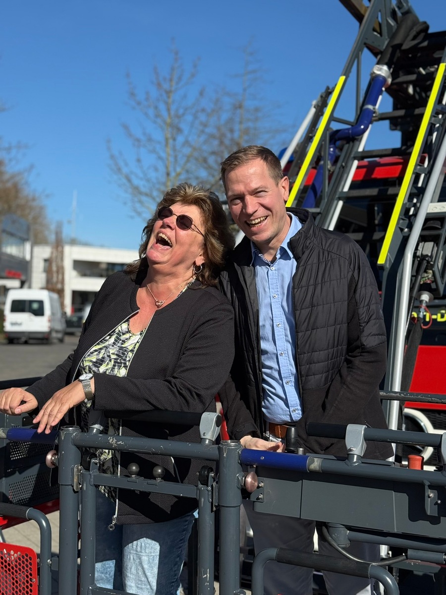 Ein ungewöhnlicher "Alarm" sorgte jetzt vor dem Stadthaus für Aufmerksamkeit: "KORDI A.D. - Pension droht!! DLK zur sofortigen Rettung der Dezernentin in den Ruhestand!". Was zunächst wie ein echter Einsatz klang, entpuppte sich schnell als liebevoll geplante Überraschung zur Verabschiedung von Kordula Mertens, die nach Jahrzehnten im Dienst der Stadtverwaltung in den Ruhestand verabschiedet wurde.