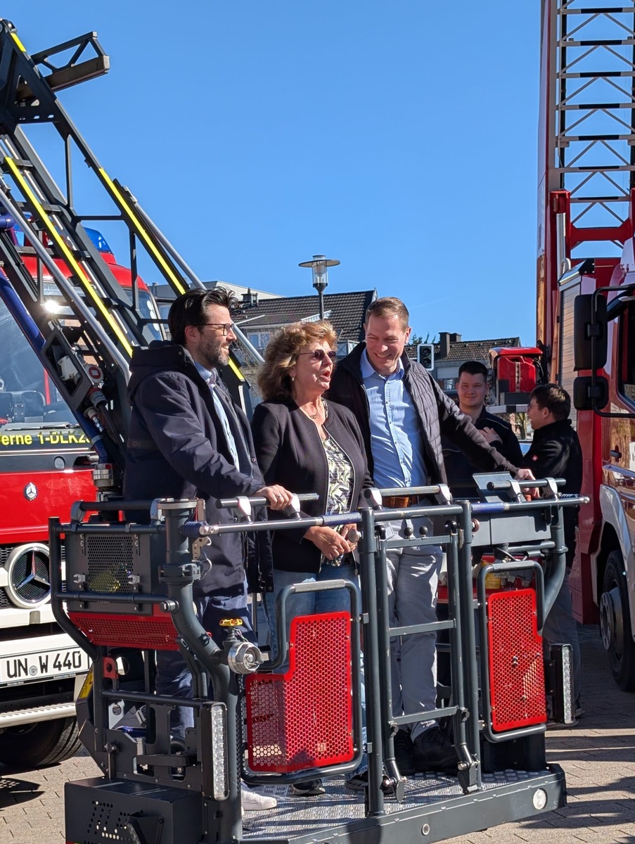 Für einen besonderen Höhepunkt sorgten die hauptamtlichen Gerätewarte der Feuerwehr: Mit der Drehleiter rückten sie an, um "Kordi", wie sie von vielen genannt wird, symbolisch in den Ruhestand zu "retten". Unter Applaus der versammelten Gäste ging es für die überraschte Dezernentin im Korb der Drehleiter hoch hinaus. Begleitet wurde sie dabei von Tobias Tenk, Leiter der Feuerwehr, sowie von Lars Hübchen, Bürgermeister der Stadt Werne.