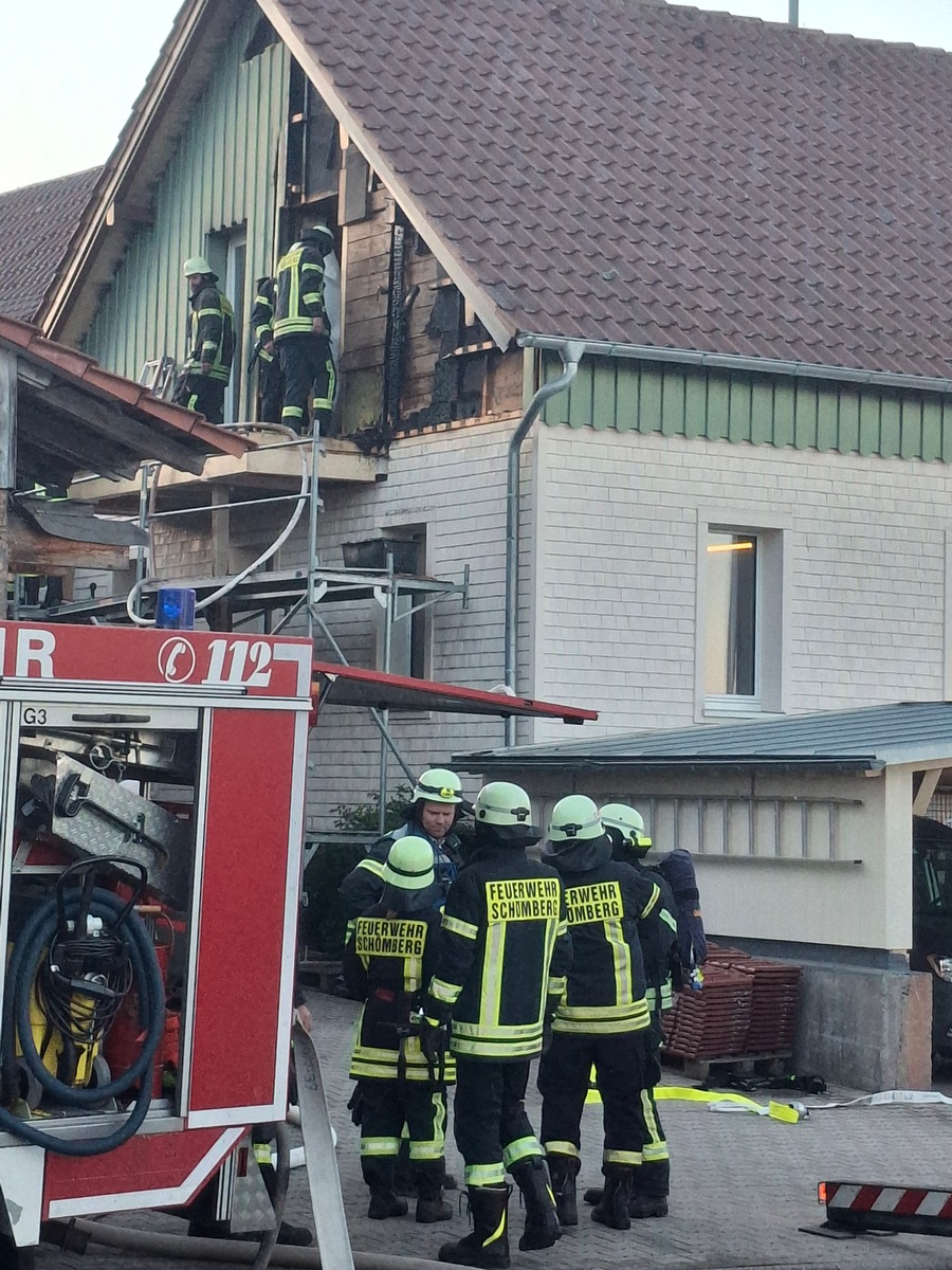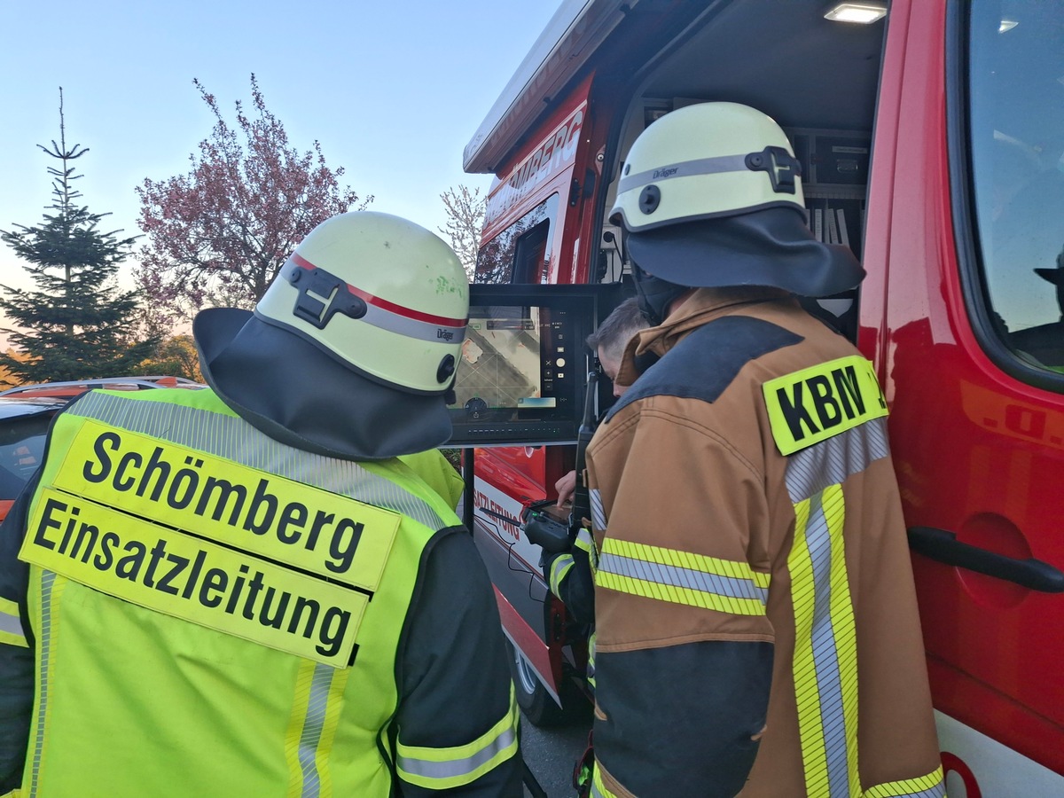 Schömberg-Oberlengenhardt. Aus bislang unbekannten Gründen hatte sich am Mittabend, 22. April unter dem Giebel an der Fassade des Bürogebäudes einer Schreinerei in Oberlengenhardt ein Feuer entwickelt. Just zu diesem Zeitpunkt im benachbarten Feuerwehrmagazin anwesende Brandschutzkräfte entdeckten dieses und lösten um 19:05 Uhr Alarm aus. "Das beherzte Eingreifen der Kameraden verhinderte einen Großbrand", konstatierte Einsatzleiter Rainer Zillinger, dass auch keine Personen verletzt wurden. Der Kommandant beschrieb eine unheilvolle Dynamik des aufsteigenden Rauchs, die er selbst auf der Anfahrt zum Einsatzort beobachtete. Da dieser bereits durch die Dachziegel nach außen drang, aktivierte er zusätzlich die Drohnengruppe aus Bieselsberg. Parallel zum Löschangriff, auch über die Drehleiter veranlasste der Einsatzleiter die Trennung des Gebäudes vom Strom sowie die Beseitigung von Elektrogeräten im Gebäudeinneren. "Das Feuer hatte sich den Weg hinter die Verschalung der Fassade gesucht, wo dann verbaute Holzweichfaserplatten mit dem Löschwasser reagierten und ein Ausbreiten der Flammen verhindert wurde", fasste Zillinger das Eindämmen des Brandes zusammen. Durch den Einsatz der Drohne konnte die Feuerwehr zudem auf das Abdecken des Daches verzichten, da die Bilder keinen Gefahrenbereich mit erhöhten Temperaturen oder Flammenbewegung aufwiesen. Davon überzeugten sich vor Ort am Bildschirm der Übertragung unter anderem Kreisbrandmeister Bernd Meyer und sein Stellvertreter Tido Lüdtke sowie Schömbergs Bürgermeister Dr. Matthias Stepan. Das umsichtige Vorgehen der Brandschutzkräfte begrenzte den Sachschaden auf rund 20.000 Euro, zumal im Gebäudeinneren kein Wasserschaden festzustellen war. Nach rund zwei Stunden konnte der Einsatz beendet werden, wenngleich die Feuerwehrabteilung Oberlengenhardt noch Brandwache hielt. Die Feuerwehr war mit 50 Brandschutzkräften und sieben Fahrzeugen im Einsatz, der DRK Ortsverein Schömberg-Liebenzell mit zwei Fahrzeugen und fünf Kräften sowie die Polizei mit vier Beamten und zwei Fahrzeugen. Für die Dauer des Einsatzes blieb die Ortsdurchfahrt Oberlengenhardt gesperrt.