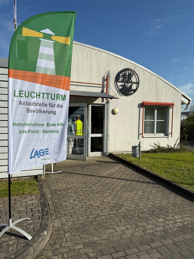 Im Rahmen der sogenannten "Leuchtturmübung" trainierten Einsatzkräfte unter realistischen Bedingungen den Betrieb einer Anlaufstelle für die Bevölkerung. Solche Leuchttürme dienen im Krisenfall als zentrale Punkte, an denen Bürgerinnen und Bürger Hilfe erhalten, Notfälle melden und Informationen bekommen können.