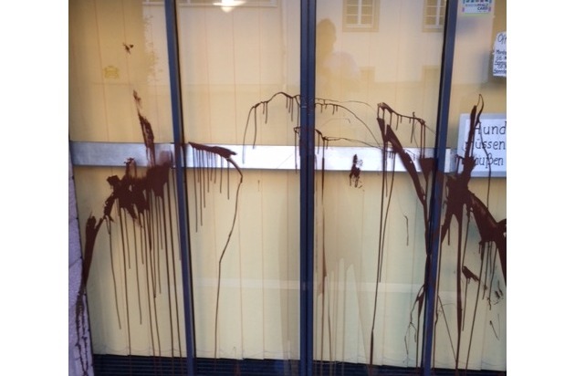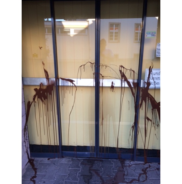 In der Nacht zum Donnerstag zwischen 21:00 und 07:00 Uhr beschmutzten die Täter Teile des Haupteinganges mit brauner Farbe.