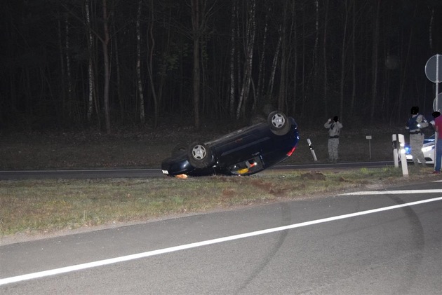 Am 07.04.2017 gegen 20:15 Uhr wollte ein 19 jähriger Autofahrer von der B270 aus Richtung Weilerbach kommend auf die BAB 6 in Richtung Saarbrücken auffahren. Aufgrund zu hoher Geschwindigkeit bremste er in der Kurve der Auffahrt abrupt ab, was dazu führte, dass das Auto ins Schleudern geriet. In der Folge rutsche er links auf die Grünfläche, wo er umkippte und auf der Ausfahrtspur der BAB 6 auf dem Dach liegend zum stehen kam. Der Fahrer und sein Beifahrer blieben bei dem Unfall unverletzt. Am Fahrzeug entstand ein Sachschaden von ca. 3000 Euro. Die Autobahnpolizei wurde bei der Unfallaufnahme durch die amerikanische Militärpolizei unterstützt.