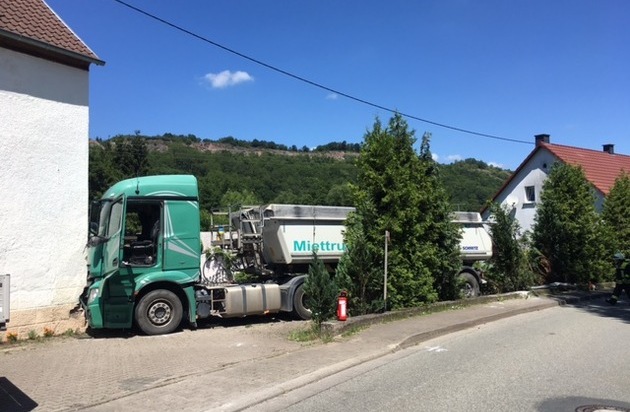 Am Mittwoch, 20. Juni 2018 gegen 09:50 Uhr, kam es in der Ortschaft Rutsweiler am Glan, Hauptstraße, zu einem schweren Verkehrsunfall. Alleinbeteiligt war ein mit Teer beladener 40-Tonner LKW, welcher laut Zeugenwahrnehmungen ungebremst gegen die Hauswand eines Anwesens fuhr. Die Unfallursache wird zurzeit noch ermittelt. Der Unfallfahrer wurde vor Ort durch den Notarzt versorgt und anschließend in das Westpfalzklinikum verbracht. Die Ortsdurchfahrt musste für den Fahrzeugverkehr voll gesperrt werden. Vor Ort zum Einsatz kam neben der Feuerwehr, Polizei, Straßenmeisterei, Rettungsdienst, THW und Notarzt auch ein Gutachter, der über das Ausmaß des Gebäudeschadens eine Aussage treffen muss.