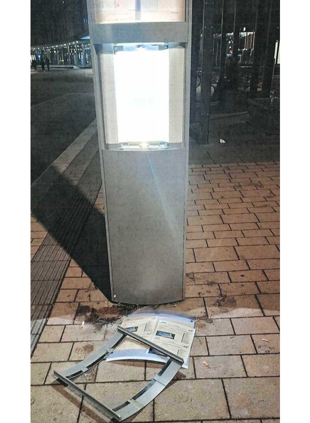 In der Nacht zum Sonntag beschädigten unbekannte Täter eine Infosäule der Stadtwerke in der Fruchthallstraße. Die Unbekannten traktierten die Säule an der neuen Stadtmitte derart, dass ein Schaden in Höhe von circa 600 Euro entstand.