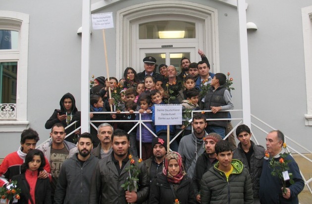 Für eine Überraschung haben am Mittwochmorgen rund 70 Flüchtlinge gesorgt, die gegen 10 Uhr die Polizeiinspektion Kusel besucht haben um sich bei den Beamtinnen und Beamten zu bedanken. Bei der Personengruppe handelte sich um Frauen, Kinder, junge Männer und Ehepaare, die derzeit noch in der Aufnahmeeinrichtung für Asylsuchende (Afa) Kusel leben und demnächst in anderen Landkreisen und Städten untergebracht werden. Mit der Aktion wollten sie sich bei der Polizei Kusel und insbesondere beim Bezirksbeamten Dieter Morgenstern für die gute Betreuung und Gastfreundschaft bedanken und überreichten den Polizistinnen und Polizisten Blumen. Die Afa gehört zum Zuständigkeitsbereich des Bezirksbeamten, der sichtlich gerührt war: "Ich habe mich riesig gefreut und fühle mich in meiner Handlungsweise bestätigt", erklärte Morgenstern nach dem Überraschungsbesuch. An den überreichten Rosen Papieranhänger angebracht, auf denen in verschiedenen Sprachen stand: "Danke Deutschland - Danke Kusel!" Nach dem Besuch bei der Polizei zog die Gruppe weiter, um sich in Geschäften und anderen Einrichtungen ebenfalls "Danke" zu sagen.