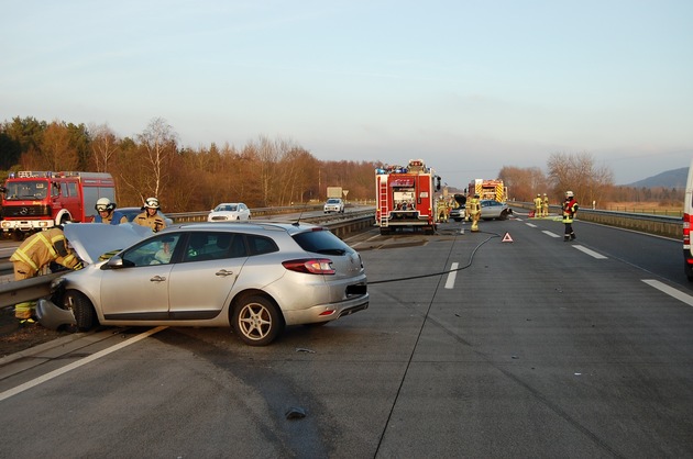 Dabei fuhr ein 29-jähriger Pkw-Fahrer aus dem Landkreis aus noch ungeklärter Ursache auf einen vor ihm, auf dem rechten Fahrstreifen fahrenden Pkw auf. Durch den Zusammenstoß geriet das vordere Fahrzeug ins Schleudern und drehte sich nach links in die Mittelschutzplanken.
