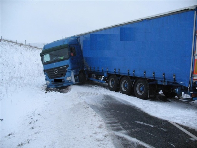 Am Freitag, 15.01.2016, gegen 13.00 Uhr befuhr ein 41-jähriger französischer LKW-Fahrer mit seiner Zugmaschine Mercedes-Benz Actros sowie Auflieger die L 700 vom Flughafen Zweibrücken kommend in Fahrtrichtung Hornbach. Auf der abschüssigen Strecke kam der Zug aufgrund nicht angepasster Geschwindigkeit auf winterglatter Fahrbahn in einer Rechtskurve ins Rutschen und brach nach links aus. Hierbei drehte sich das Führerhaus des Sattelzuges und verkeilte sich. Das Führerhaus rutschte auf der schneeglatten Fahrbahn nach links in den Graben, während der Auflieger quer auf der Fahrbahn zum Stehen kam und diese komplett blockierte. Der Sachschaden dürfte sich auf ca. 10.000 Euro belaufen. Der Sattelzug wurde mittels eines speziellen Abschleppwagens mit Seilwinde geborgen. Aufgrund der Witterungsverhältnisse mussten die Bergungsarbeiten durch die Straßenmeisterei unterstützt werden. Die L 700 war für ca. fünf Stunden gesperrt.