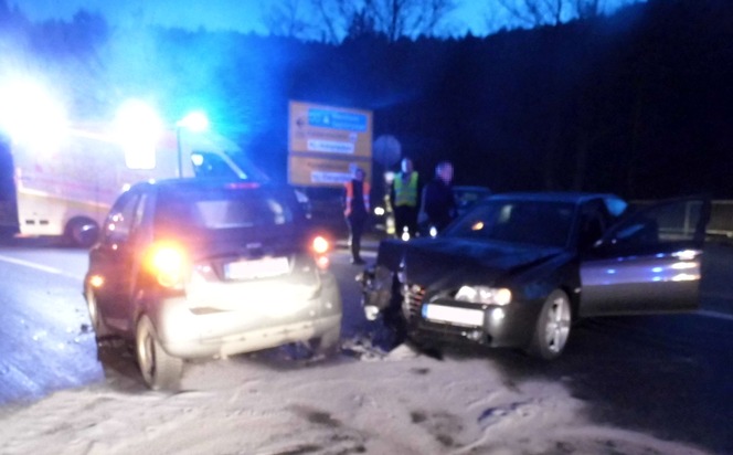 Wie die Ermittlungen vor Ort ergaben, wollte ein 64-jähriger Autofahrer, der über die L502 aus Richtung Breitenau kam, an der Einmündung mit seinem Alfa Romeo nach links auf die B270 abbiegen. Dabei nahm er jedoch einem Smart die Vorfahrt, der von Schopp kommend auf der Bundesstraße in Richtung Hohenecken fuhr. Es krachte im Einmündungsbereich, wobei sich der 52 Jahre alte Smart-Fahrer und seine 60 Jahre alte Beifahrerin Verletzungen zuzogen. Beide wurden zur weiteren Untersuchung ins Krankenhaus gebracht.