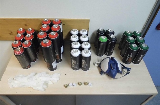 In der Nacht von Samstag auf Sonntag machten Polizeibeamte eine interessante Entdeckung. Der 33-jährige Fahrer eines Pkw und sein 24 Jahre alter Beifahrer führten in ihrem Fahrzeug eine erstaunliche Menge an vollen Farbspraydosen mit sich. Darüber hinaus hatten sie Einweghandschuhe, Sprühköpfe für Spraydosen und eine Atemschutzmaske bei sich. Eine Überprüfung des Fahrers ergab, dass dieser in der Vergangenheit bereits mit Sachbeschädigungen durch Graffiti aufgefallen war. Eine plausible Erklärung für das Mitführen der Utensilien blieben die beiden Männer schuldig, weshalb die Gegenstände zur Verhinderung von Straftaten sichergestellt wurden. Waren für die Nacht "Sprayaktionen" geplant? Die Ermittlungen hierzu dauern an.