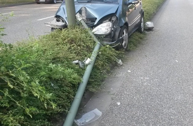 Die ausgerückte Streife fand die Situation wie beschrieben vor: Der Mercedes stand stark beschädigt auf dem Grünstreifen, der die Richtungsfahrbahnen voneinander trennt, der Laternenpfosten lag umgeknickt auf der Gegenfahrbahn.