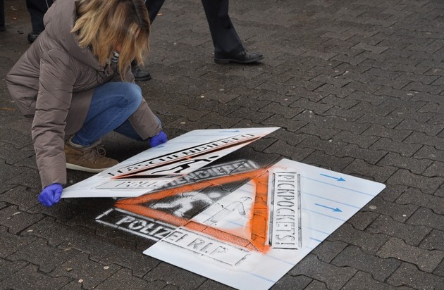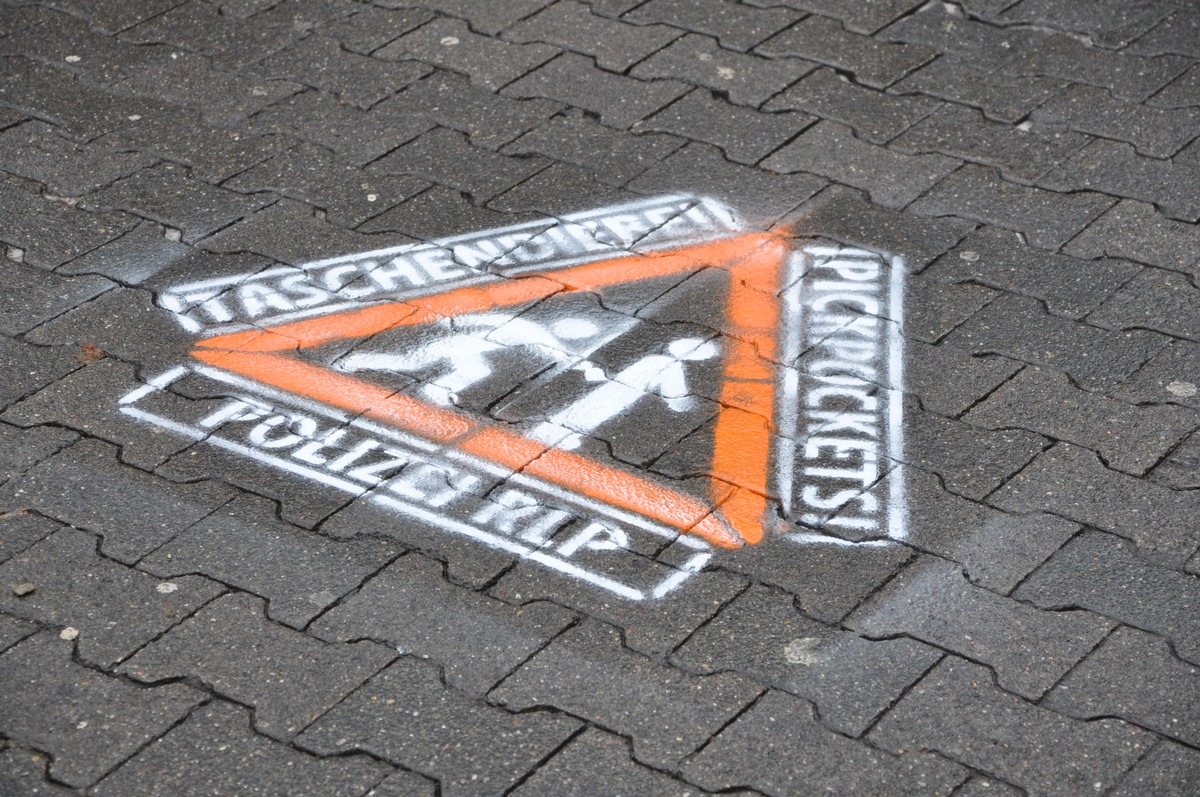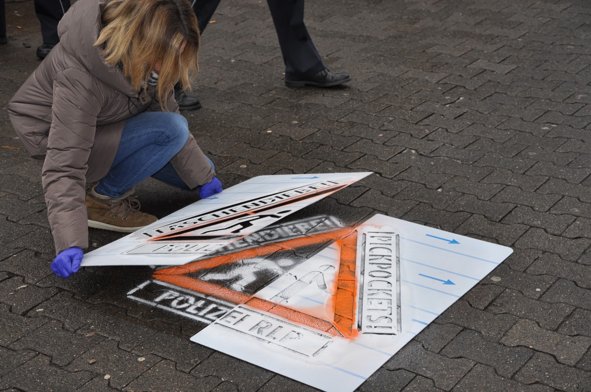Seit heute (27.11.2025) weisen große, auf den Boden aufgesprühte Warndreiecke mit dem Hinweis "Taschendiebe! Pickpockets!" auf dem Weihnachtsmarkt in Landstuhl auf die Gefahr von Langfingern hin. Am 3. Dezember 2025 wird die Aktion auch in Kaiserslautern durchgeführt. Mitarbeiterinnen und Mitarbeiter des Beratungszentrums brachten beziehungsweise bringen die auffälligen Markierungen mit Spezialkreide und Schablonen an, um Passanten zu sensibilisieren und zu mehr Wachsamkeit aufzurufen.