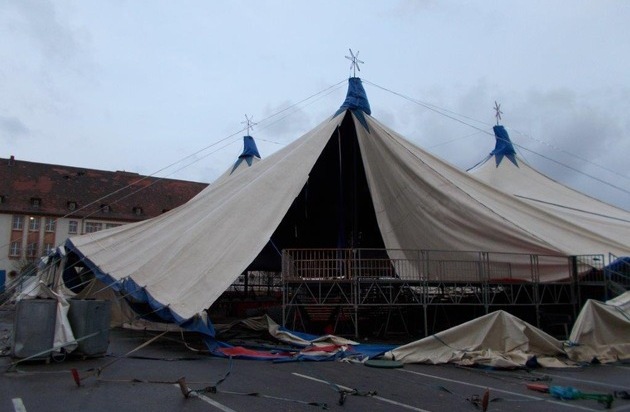 Landau: 13. Januar 2017 Das Sturmtief "Egon" bescherte der Polizei in der Nacht zahlreiche Einsätze. Ab 01.30 Uhr waren die Polizeibeamten im Dauereinsatz um witterungsbedingte Störungen zu dokumentieren und teilweise zu beheben. Durch die Sturmböen gab es mehrere Fehlalarme bei Supermärkten und öffentlichen Gebäuden. Der Schwerpunkt solcher Alarme lag im Bereich von Annweiler. Durch einen Stromausfall wurde auch die Tunnelsperrung des Löwenherztunnels aktiviert. Die Tunnelbereitschaft beseitigte die Störung. Der Sturm entwurzelte zwei Bäume. Der Baum der sich zwischen Wollmesheim und Ilbesheim über die Fahrbahn legte, konnte mit eigenen Mitteln beseitigt werden. Dagegen wurde die Feuerwehr für die Baumbeseitigung auf der Kreisstraße 40 am Ortsausgang von Offenbach im Kurvenbereich benötigt. Zwei Trampoline machten sich in Vorgärten selbstständig und flogen durch die Luft. In der Wilhelm-Schechstraße beschädigte das fliegende Trampolin eine Straßenlaterne, ehe das Fluggerät durch die Eigentümerin wieder eingefangen werden konnte. In Siebeldingen konnte das Trampolin durch die Polizeistreife eingefangen und auseinandergebaut werden. Den größten Sturmschaden wurde um 1.30 Uhr auf dem neuen Messplatz gemeldet. Der dortige Weihnachtszirkus drohte wegzufliegen. Feuerwehr und Technisches Hilfswerk waren über Stunden im Einsatz um das Tierzelt, wo Tiere untergebracht waren, und das Hauptzelt zu sichern. Durch zusätzliche Seitenstangen und Bodenverankerungen versuchte man die beiden Zelte vor Beschädigungen zu schützen, was lediglich beim Tierzelt gelang. Das Hauptzelt wurde beschädigt, indem die Dachplane durch den Wind einriss (siehe Bild). Der Besitzer schätzt den Schaden auf mindestens 300.000 Euro. Personen und Tiere wurden nicht verletzt.