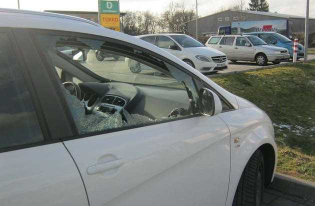 Berg-Neulauterburg; Am 17.01.2017 wurde in der Zeit von 10:30 - 10:45 Uhr durch einen unbekannten Täter die Seitenscheibe eines auf dem Parkplatz des Netto-Marktes abgestellten weißen Seat eingeschlagen. Entwendet wurde aus dem Fahrzeuginneren nichts.