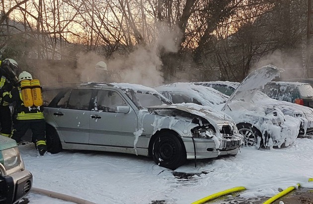 Am Samstag den 21.11.2017 gegen 16:30 Uhr melden mehrere Anrufer einen brennenden PKW in Annweiler. Die Einsatzkräfte von Polizei und Feuerwehr konnten auf dem Firmengelände eines Autohandel in der Zweibrücker Straße zwei brennende PKW feststellen. Von einem Fremdverschulden ist nicht auszugehen, sehr wahrscheinlich entstand der Brand aufgrund eines technisches Defekts im Motorraum. Der Brand griff in der Folge auf ein daneben geparktes, zweites Fahrzeug über. Die Flammen konnten schnell gelöscht werden. Es entstand ein Gesamtsachschaden von ca. 2000.- EUR. Die beiden PKW waren nicht mehr zugelassen und standen wohl unmittelbar vor ihrer "letzten Reise" auf den Schrottplatz.