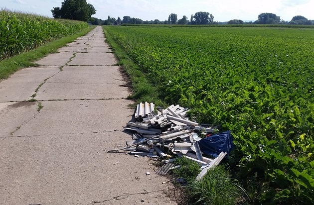Ein Radfahrer teilte bei der Polizei Landau mit, dass er regelmäßig die Kreisstraße 21 zwischen Rohrbach und Insheim befahre. Hierbei sei ihm am Rand eines Feldweges ein Haufen mit Eternitplatten aufgefallen. Durch die Polizei wurden die Ermittlungen wegen der illegalen Abfallentsorgung aufgenommen und eine Strafanzeige erstattet Sachdienliche Hinweise nimmt die Polizei in Landau unter der Telefonnummer 06341-2870 oder pilandau@polizei.rlp.de entgegen.