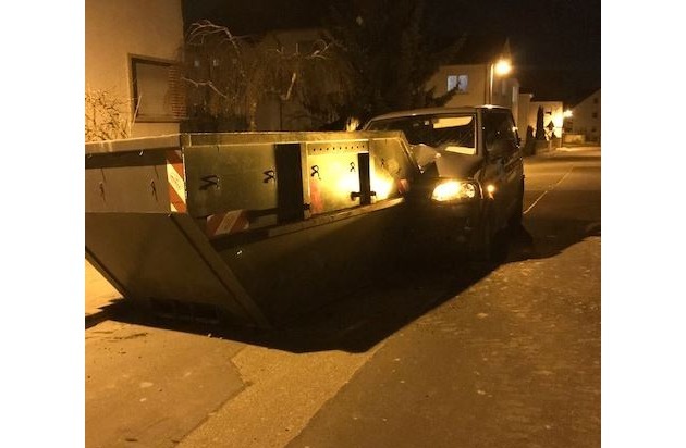 22. Februar 2018, 20.20 Uhr Eine kurze Unachtsamkeit kam einem 30-jährigen Herxheimer am Donnerstagabend teuer zu stehen. In der Kesslerstraße übersah der Fahrer eines VW-Transporters einen mit Bauschutt am Straßenrand abgestellten Baucontainer und prallte frontal auf das Hindernis. Am Fahrzeug wurde die komplette Motorhaube eingedrückt (siehe Bild). Am Fahrzeug entstand ein Totalschaden in Höhe von mindestens 3.000 Euro. Bei dem Anstoß verletzte sich der Fahrer leicht an der Hand.