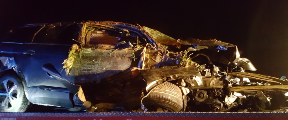 22. April 2018, 00.54 Uhr In der Nacht von Samstag auf Sonntag verunglückte ein 33-jähriger Peugeot-Fahrer aus Herxheim auf der Kreisstraße zwischen Mörlheim und Insheim. In einer leichten Linkskurve kam er von der Straße ab, berührte ein Brückengeländer und fuhr anschließend gegen einen Baum. Das Auto hob ab, überschlug sich und kam auf dem Dach liegend zum Stillstand. Der Fahrer konnte sich selbstständig befreien. Angesichts des total zerlegten Wagens (siehe Bild) kam der Mann noch glimpflich davon. Mit Prellungen am Körper wurde er ins Krankenhaus gebracht. Sein Auto hatte nur noch Schrottwert. Ursächlich für den Unfall dürfte der genossene Alkohol (1,9 Promille) gewesen sein.